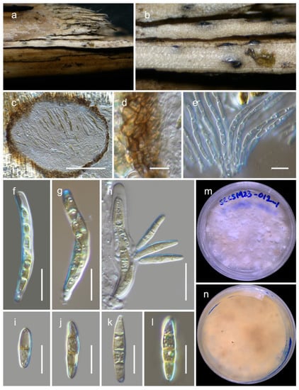 Phaeosphaeria poagena (HKAS 129196): (a,b) ascomata on the bamboo culms; (c) vertical section through an ascoma; (d) peridium; (e) pseudoparaphyses; (f–h) asci ((h) showing a fissitunicate ascus); (i–l) ascospores; (m,n) colonies on PDA after 6 weeks. Scale bars: (c) 100 µm; (d,e,i–l) 10 µm; (f–h) 20 µm.