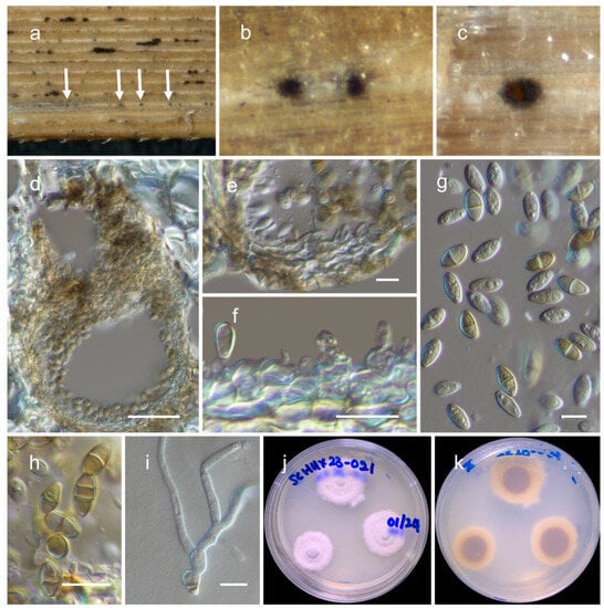Phaeosphaeria sichuanensis (HKAS 129194, holotype): (a,b) conidiomata on the dead Pandanaceae leaves (arrowed); (c) horizontal section of conidiomata; (d) vertical section through a conidioma; (e,f) pycnidial wall showing immature and mature conidia attached to conidiogenous cells; (g,h) conidia; (i) germinated conidium; (j,k) colonies on PDA after 6 weeks. Scale bars: (d) 50 µm; (e–i) 10 µm.