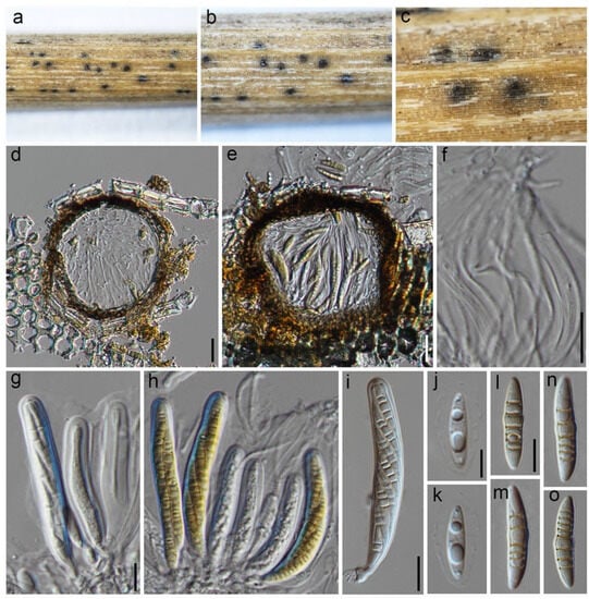 Septoriella paradactylidis (HKAS 129216): (a–c) ascomata on the host; (d,e) cross section of ascomata; (f) pseudoparaphyses; (g–i) asci; (j–o) ascospores. Scale bars: (d,f,g,i) 20 µm; (j,l) 10 µm, scale bar of (d) applies to (e), scale bar of (g) applies to (g–i), scale bar of (j) applies to (k), and scale bar of (l) applies to (l–o).