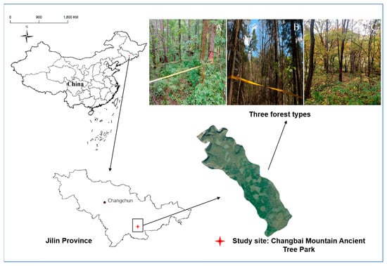 Geographical location of the Changbai Mountain Ancient Tree Park in relation to the China map, the Jilin Province map, and the three forest types we studied. (A) Broad-leaved forest; (B) coniferous forest; (C) mixed forest.