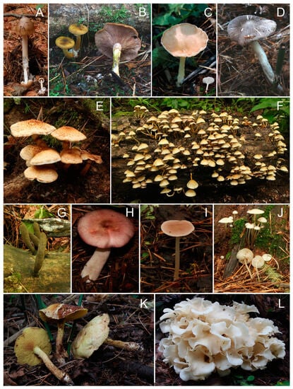 A collection of photographs showing various macrofungi species found in the Ancient Tree Park. (A) Amanita fulva; (B) Armillaria gallica; (C) Clitocybe gibba; (D) Tricholoma terreum; (E) Pholiota squarrosa; (F) Hypholoma fasciculare; (G) Xylaria longipes; (H) Russula madrensis; (I) Mycena pura; (J) M. laevigata; (K) Boletus kauffmanii; (L) Sparassis latifolia.