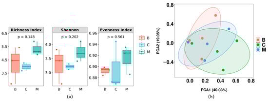 Alpha diversity analysis (a) and PCA analysis (b) of macrofungi in three forest types. B: Broad-leaved forest; C: coniferous forest; M: mixed forest. Significance was determined by the Kruskal–Wallis test with Dunn’s multiple comparison test. (p < 0.05). The sample sizes are as follows: B (n = 3), C (n = 3), M (n = 3).