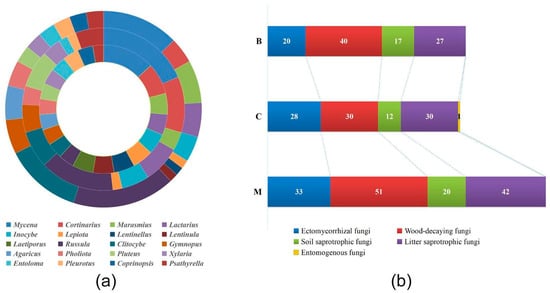 Regarding the species compositions of the three forest types, we observed a consistent trend in which the compositions of the broad-leaved forest (B) and coniferous forest (C) exhibited similarities but differed from the mixed forest (M), as shown in Figure 4a. In the broad-leaved forest (B), the genera Mycena (10 species) and Cortinarius (6 species) were the richest, with the number of species exceeding five. Similarly, in the coniferous forest (C), the genera Mycena (10 species), Russula (8 species), and Cortinarius (6 species) were the richest. In the mixed forest (M), the genera Russula (12 species), Mycena (9 species), Clitocybe (9 species), Armillaria (5 species), and Marasmius (5 species) exhibited the highest richness.