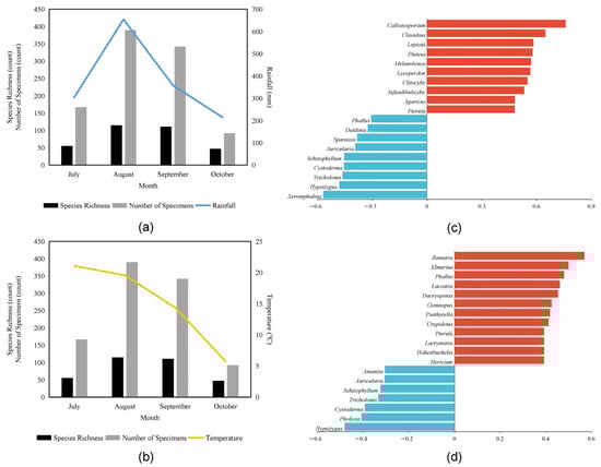 Relationships among climate, species richness, and number of specimens. (a) Relationships among species richness, number of specimens, and rainfall. (b) Relationships among species richness, number of specimens, and temperature. (c) Spearman correlation analysis of macrofungal abundance and rainfall. (d) Spearman correlation analysis of macrofungal abundance and temperature. The horizontal axis represents the value of correlation coefficients, and the vertical axis represents the genera of macrofungi.