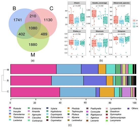 Bioinformatic analysis of soil fungi under different forest types. (a) Venn diagram of Amplicon Sequence Variants; (b) alpha diversity analysis; (c) relative abundance of fungal communities at the genus level. B: broad-leaved forest; C: coniferous forest; M: mixed forest.