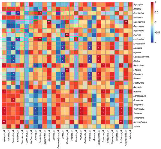 Correlation heatmap of macrofungi and soil fungi. The x-axis of the heat map represents different soil fungal genera, while the y-axis represents macrofungal genera. Each cell in the heat map represents the correlation coefficient between a specific pair of macrofungi and soil fungi genera. The cells are color-coded to indicate the strength and direction of the correlation. A dark shade of red indicates a strong positive correlation, a dark shade of blue represents a strong negative correlation, and neutral colors signify no correlation. A single star (*) indicates that the correlation between the corresponding soil fungal genus and the macrofungal genus is statistically significant at the p < 0.05 level. Two stars (**) indicate that the correlation is even more statistically significant at the p < 0.005 level.