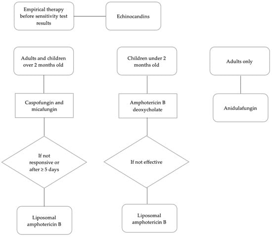 Currently, azoles (e.g., fluconazole; itraconazole; isavuconazole; posaconazole; sertaconazole; voriconazole), polyenes (e.g., amphotericin B; nystatin) echinocandins (e.g., anidulafungin; caspofungin; micafungin) and nucleoside analogues (e.g., 5-flucytosine) are the main drugs used to treat fungal infections. The choice of antimycotic depends on the type and anatomical site of infection and fungal susceptibility. The CDC recommends the use of echinocandins as empirical therapy in the treatment of patients infected with C. auris, pending the availability of sensitivity test results []. Fluconazole and the echinocandins are the antifungal agents most used for the treatment of Candida bloodstream infection (candidaemia). Both are better tolerated than amphotericin B, which is less often prescribed due to the risk of toxicity []. Caspofungin and micafungin are recommended in the treatment of adults and children over 2 months of age, while anidulafungin is only recommended for adults. It is very important to follow the clinical course of these patients by repeating sensitivity tests to assess a possible acquisition of resistance. If the patient is not responsive to treatment with echinocandins or if the infection is persistent for more than five days, a switch to liposomal amphotericin B is recommended. In neonates and infants under two months of age, the initial choice of treatment is amphotericin B deoxycholate. If this is not effective, a switch to liposomal amphotericin B may be considered. Echinocandins may only be used in exceptional circumstances and only after ruling out central nervous system involvement (Figure 2) [,].