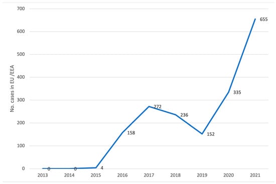 In Europe and the European Economic Area (EU/EEA), 670 cases were reported in the period January 2013—December 2018. In the period 2019 to 2021, another 1142 cases were reported (Figure 3) [].