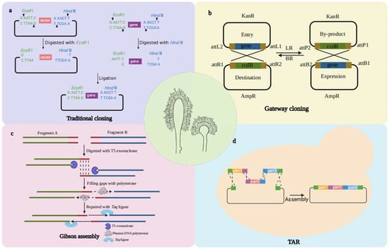 Originating in the early 1970s, conventional DNA manipulation via restriction/ligation constitutes one of the pioneering approaches in molecular biology (Figure 1a). This technique entails cleaving the double-stranded DNA target fragment with a restriction endonuclease, yielding single-stranded sticky or blunt ends. Subsequently, the digested fragment is ligated into vector DNA with matching ends, generating a novel vector capable of expressing the target gene. Having existed for more than five decades, this DNA recombination technique has been widely used for A. oryzae; for example, Ryuya Fujii et al. successfully harnessed this technique to introduce four heterologous genes into vectors to construct a pathway for aphidicolin in the A. oryzae NSAR1 strain [9]. Hiroyuki Uchida et al. used this method to construct a pNAN8142 vector and transfected it into the A. oryzae RIB40 niaD− strain to synthesize phytate [10].