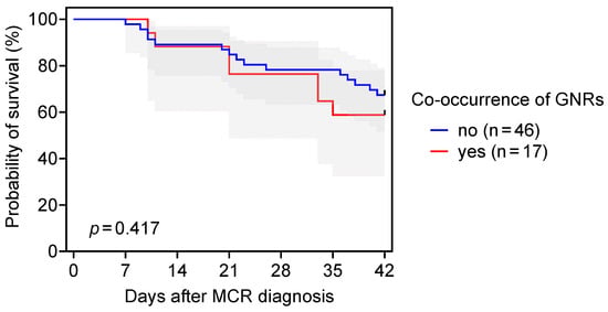 Survival curves for patients with hematologic malignancy and sinopulmonary mucormycosis (MCR), with and without co-occurrence of Gram-negative rods (GNRs). Error bands indicate 95% confidence intervals. Mantel–Cox log-rank test.