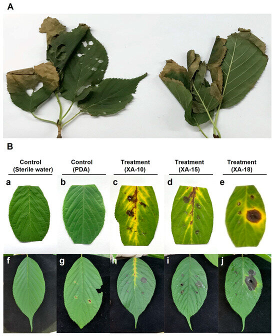 Disease symptoms in greenbelts and pathogenicity tests of the 3 selected isolates (XA-10, XA-15, and XA-18) on host leaves. (A) Symptoms on naturally infected leaves of Cerasus serrulata. (B) Pathogenicity test for leaf blight symptoms caused by mycelial inoculation of the 3 selected isolates on the host plant (flowering cherry) leaves after 5 days. (B: a–e) Pathogenicity on detached leaves of host plants after 5 days of inoculation. (B: f–j) Pathogenicity on leaves of live host plants after 5 days of inoculation.