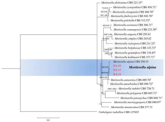 Maximum likelihood (ML) phylogram of the 3 selected isolates (XA-10, XA-15, and XA-18) based on the combined 2-locus (ITS and LSU) sequences. The tree is rooted in Umbelopsis isabellina (CBS 127635). Maximum likelihood bootstrap values ≥ 50% and Bayesian posterior probabilities ≥ 0.85 (PP/MLBS) are given at the nodes. Maximum likelihood bootstrap values < 50%, Bayesian posterior probabilities < 0.85 (PP/MLBS) are indicated with “-”. The type species is represented by “T”. The 3 selected isolates in this study are shown in red. The scale bar represents the expected number of changes per site.