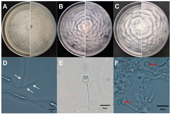 Morphological features of Mortierella alpina. (A–C) Colony morphologies (front and back) of the 3 selected isolates (XA-10, XA-15, and XA-18) on PDA medium incubated at 28 °C for 7 days. (D–F) Septate hyphae (white arrows), sporangium, and spherical and nearly spherical sporangiospores (red arrows) of the representative strain XA-10 after 7 days of incubation on OA medium at 28 °C. Scale bar = 10 µm.