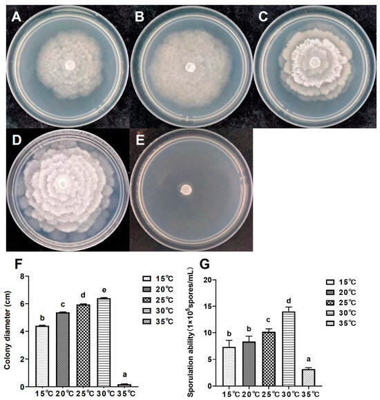 Colony morphology, diameter, and sporulation ability of the representative strain XA-10 at different temperatures. (A–E) Colony morphology of isolate XA-10 at 15–35 °C on PDA medium. (F,G) Colony diameter and sporulation quantity of isolate XA-10 at different temperatures. Values of ±standard error are represented with error bars, and different letters indicate significant differences at p < 0.05.