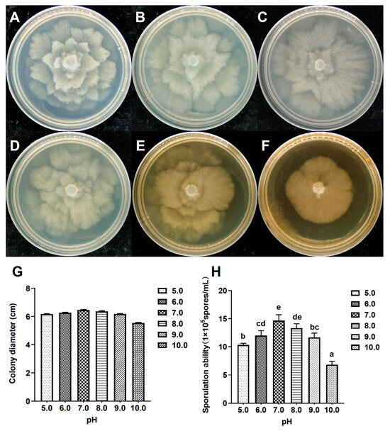 The effects of varying pH values on the mycelial growth and sporulation capacity of the isolate XA-10 are shown in Figure 5. The isolate showed similar growth characteristics within the pH value range of 5.0–10.0 (Figure 5A–F), and the colony diameters ranged from 5.53 ± 0.04 cm to 6.46 ± 0.03 cm (Figure 5G). The mycelia grew well at pH values between 5.0 and 10.0, and a pH range of 5.0 to 9.0 was more suitable for mycelial growth (Figure 5A–E). Sporulation was highest (1.47 × 106 spores/mL) at neutral pH (7.0) (Figure 5H). The lowest sporulation was observed at pH 10.0 (6.83 × 105 spores/mL), as shown in Figure 5H. Although no significant differences were found in mycelial growth under various pH conditions (p < 0.05), the sporulation of isolate XA-10 was significantly affected by pH.