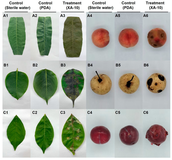 Pathogenicity of the representative strain XA-10 on leaves and fruits of three other Rosaceae plants. (A1–A6) Detached leaves and fruits of Prunus persica; (B1–B6) detached leaves and fruits of Pyrus bretschneideri; and (C1–C6) detached leaves and fruits of Prunus salicina. The photographs of P. persica were taken 4 days post-inoculation and of P. bretschneideri and P. salicina were taken 5 days post-inoculated.