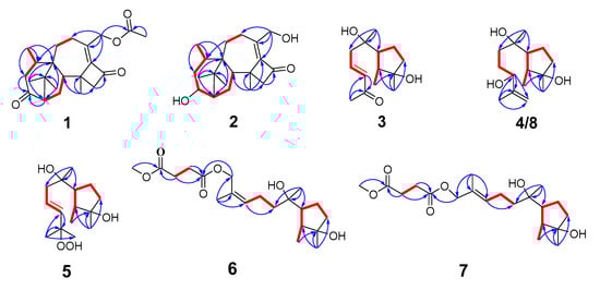 Key HMBC (bold lines) and 1H–1H COSY (arrows) correlations of compounds 1–8.