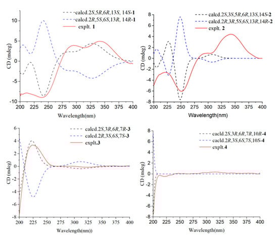 Calculated ECD spectra and experimental ECD curves of compounds 1–4 in MeOH.