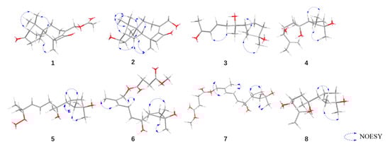 Key NOESY correlations of compounds 1–8.