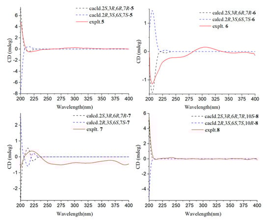 Calculated ECD spectra and experimental ECD curves of compounds 5–8 in MeOH.