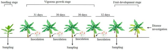 Experimental design of the field trial. The banana plant with yellow leaves shows symptoms of banana wilt. Samples were collected at the seedling, vigorous growth, and fruit development stages as shown. Biocontrol agent treatments were applied approximately every 30 days during the vigorous growth stage, for a total of four treatments.