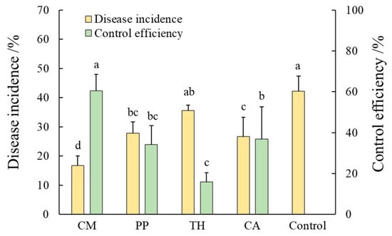Effects of different inoculation treatments on the disease incidence and control efficiency of banana Fusarium wilt. CM, compound microbial agent; PP, Paenibacillus polymyxa; TH, Trichoderma harzianum; CA, carbendazim. Significant differences (p < 0.05) among treatments are indicated by different letters.