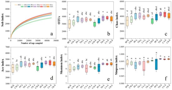 Bacterial richness and diversity of banana rooted soils at the seedling, vigorous growth, and fruit development stages. (a) Sob rarefaction curve; (b) Number of operational taxonomic units (OTUs); (c) Chao index; (d) Ace index; (e) Shannon index; (f) Simpson index. CM, compound microbial agent; PP, Paenibacillus polymyxa; TH, Trichoderma harzianum; CA, carbendazim; BCK, before treatment; CK, control. Letters a and b indicate the vigorous growth and fruit development stages, respectively. Values are the means ± standard deviations (SD) (n = 3). Different letters indicate significant differences among the treatments (p < 0.05).