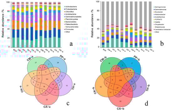 Bacterial composition of banana rooted soil from different treatments. (a,b) Bacterial composition at the phylum level (a) and genus level (b). (c,d) Venn diagrams showing shared and unique bacterial genera in the five treatments at the vigorous growth stage (c) and fruit development stage (d). CM, compound microbial agent; PP, Paenibacillus polymyxa; TH, Trichoderma harzianum; CA, carbendazim; BCK, before treatment; CK, control. Letters a and b indicate the vigorous growth and fruit development stages, respectively. “Other” indicates the relative abundance of all phylum-level or genus-level classifications other than the top 10 presented and named in the lists (a,b).
