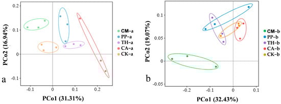 Weighted UniFrac principal coordinate analysis (PCoA) of the soil bacterial communities of banana under different treatments. (a) Vigorous growth stage; (b) Fruit development stage. CM, compound microbial agent; PP, Paenibacillus polymyxa; TH, Trichoderma harzianum; CA, carbendazim; CK, control. Letters a and b indicate the vigorous growth and fruit development stages, respectively.