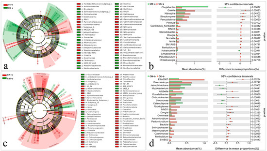 Differences in the abundance of bacterial taxa and identification of biomarkers associated with the compound microbial agent (CM) and control (CK) treatments. (a,b) LEfSe analysis of the bacterial community (a) and Welch’s t-tests of bacterial abundance at the genus level (b) at the vigorous growth stage. (c,d) LEfSe analysis of the bacterial community (c) and Welch’s t-tests of bacterial abundance at the genus level (d) at the fruit development stage. In (a,c), tracks from inside to outside represent classification levels from phylum to genus. Each small solid circle represents a taxon at that level, and the size of the circle is proportional to the relative abundance of the taxon. Taxa with an LDA score > 3.0 and p < 0.05 are shown. In (b,d), n = 3 and p < 0.05.