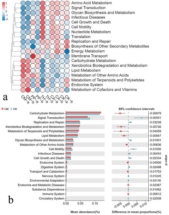Metabolic functions of bacterial communities of banana rooted soil predicted by Tax4Fun. (a) Clustered heatmap showing the relative abundance of the top 20 KEGG metabolic pathways across all samples; red indicates higher abundance and blue indicates lower abundance. CM, compound microbial agent; PP, Paenibacillus polymyxa; TH, Trichoderma harzianum; CA, carbendazim; CK, control. The letters a and b indicate the vigorous growth stage and fruit development stage, respectively. (b) Significant differences in the abundance of different functions between the CM and CK treatments were analyzed with Welch’s t-test (n = 3, p < 0.05).
