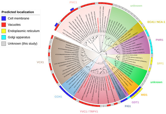 Cladogram of calcium transport proteins. We used sequences of characterized proteins present in the cell membrane, vacuoles, endoplasmic reticulum, and Golgi apparatus together with T. reesei proteins of unknown localization identified in this study. The support values from 1000 resamples are indicated by the black circles, varying from 0 to 1. The figure only shows values from 0.8 to 1, from smaller to larger size.