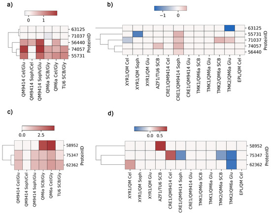 In relation to the genes homologous to PMC1 (Figure 2c), we primarily observed that gene 58952 is upregulated in QM6a under both conditions analyzed. Interestingly, we found that gene 58952 was differentially expressed only in the absence of AZF1. The genes 75347 and 62362 were slightly upregulated in the commonly used parental strains in all conditions, except in QM9414 in the presence of sophorose in relation to cellulose. Finally, gene 75347 was also downregulated in the mutant strains lacking CRE1, TMK1, and TMK2, while gene 62362 was downregulated only in the absence of TMK2.