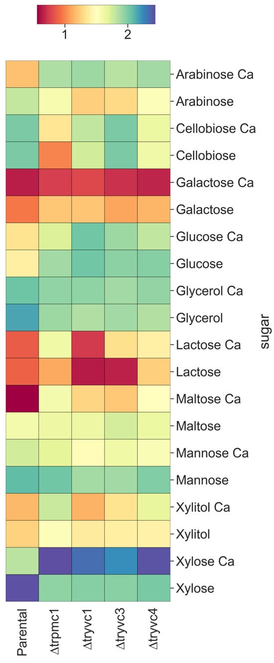 Growth of strains QM6a∆tmus53∆pyr4 (parental), ∆trpmc1, ∆tryvc1, ∆tryvc3, and ∆tryvc4 in minimal media in the presence of 25 mM of different carbon sources for 72 h, with and without 10 mM CaCl2 supplementation. The values represent the absorbance readings at 750 nm.