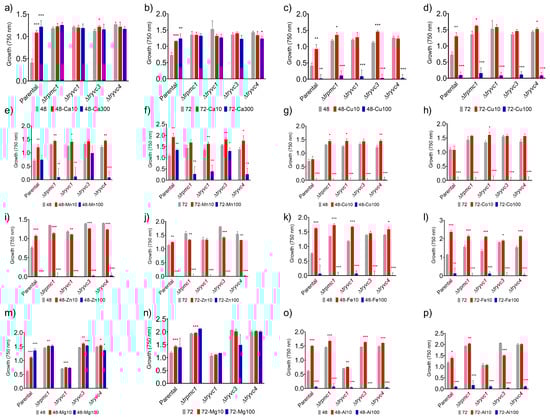 Growth of strains QM6a∆tmus53∆pyr4 (parental), ∆trpmc1, ∆tryvc1, ∆tryvc3, and ∆tryvc4 in 25 mM xylose minimal media for 48 or 72 h in the presence of 10, 100, or 300 mM of the metals calcium (a,b), copper (c,d), manganese (e,f), cobalt (g,h), zinc (i,j), iron (k,l), magnesium (m,n) or aluminum (o,p). Significance levels are indicated as follows: * p < 0.05, ** p < 0.01, and *** p < 0.001 in relation to the parental strain (Student’s t-test). The control condition (gray bars) was calculated for each microplate.