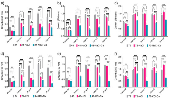 We examined the tolerance of T. reesei parental and mutant strains to elevated osmotic pressure by growing them on plates under osmotic stress conditions, specifically in the presence of 0.5 M NaCl or 0.5 M KCl, with and without calcium (Figure 5). Both NaCl and KCl inhibited growth of all strains at 24 h (Figure 5a,d), but by 72 h, the strains recovered and exhibited growth levels comparable to or higher than the control condition (Figure 5c,f). Notably, calcium supplementation led to a reduction in growth in the mutant strains, but not in the parental strain, at both 24 and 48 h (Figure 5a,b,d,e). This observation suggests that effective calcium signaling plays a pivotal role in T. reesei’s initial response to osmotic stresses.