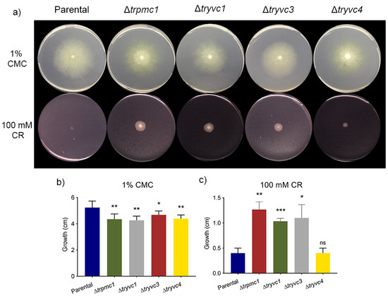 Growth analysis of strains QM6a∆tmus53∆pyr4 (parental), ∆trpmc1, ∆tryvc1, ∆tryvc3, and ∆tryvc4 in MA with 1% carboxymethylcellulose (CMC) for 5 days or 2% glucose + 100 mM Congo red (CR) for 3 days. (a) growth in plates, (b) growth measurements in 1% CMC and (c) 100 mM CR. Significance levels are indicated as follows: * p < 0.05, ** p < 0.01, and *** p < 0.001 (Student’s t-test). Non-significant results are indicated as ‘ns’.