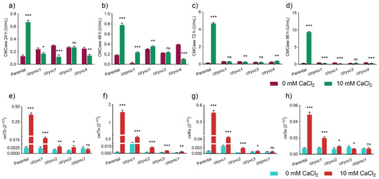CMCase activity of parental and mutant strains grown for 24 h in MA media with 1% cellulose with or without 10 mM CaCl2 supplementation for 24 h (a), 48 h (b), 72 h (c), and 96 h (d), and gene expression of endoglucanase (cel7b) (e), cellobiohydrolases (cel7a and cel6a) (f,g) and beta-glucosidase (cel3a) (h). Significance levels are indicated as follows: * p < 0.05, ** p < 0.01, and *** p < 0.001 (Student’s t-test). Non-significant results are indicated as ‘ns’.