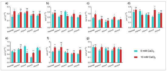 With respect to the transcription factors, we observed statistically significant differences only for xyr1 and hac1a in the parental strain supplemented with CaCl2, compared to the control without supplementation (Figure 8a,c). This observation is consistent with the detected increase in cellulase expression. In the mutant strains, however, we did not observe an increase in xyr1, and for hac1a, an increase was only noted in the ∆tryvc3 and ∆tryvc4 strains, but to a lesser extent than in the parental strain (Figure 8a,c). Furthermore, we observed an increase in crz1 expression in ∆tryvc3 when supplemented with CaCl2 (Figure 8e), and a decrease in ace3 in ∆tryvc1 when supplemented with CaCl2 (Figure 8b), both when compared to the control condition without the addition of the metal.