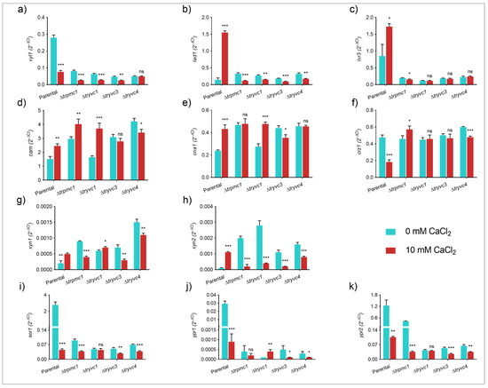 Gene expression of xylose metabolism enzymes (a–c), calcium signaling components (d–f), xylanases (g,h), and secondary metabolites components (i–k) of parental and mutant strains grown on MA media with 25 mM xylose for 48 h. * p < 0.05, ** p < 0.01, and *** p < 0.001 (Student’s t-test). Non-significant results are indicated as ‘ns’.