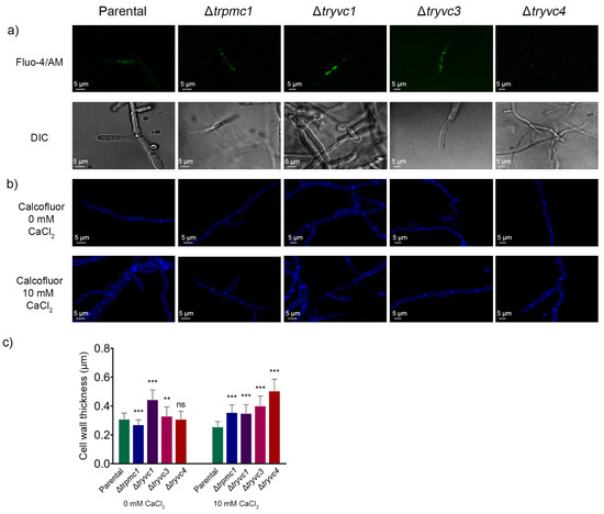Given our observation that the ∆trpmc1, ∆tryvc1, and ∆tryvc3 mutant strains exhibit greater resistance to wall stress induced by CR than the parental strain (Figure 6a,c), we measured and calculated the wall thickness of the strains under study using calcofluor white labeling (CFW) (Figure 10b,c). Our analysis revealed that all mutant strains exhibited cell wall thickening when calcium was added (Figure 10c). However, in the absence of calcium, only the ∆tryvc1 and ∆tryvc3 strains were found to have thicker walls than the parental strain (Figure 10b). So, this result suggests the knockout strains have a high tolerance to stress agents, which could be explained by cell wall thickening.