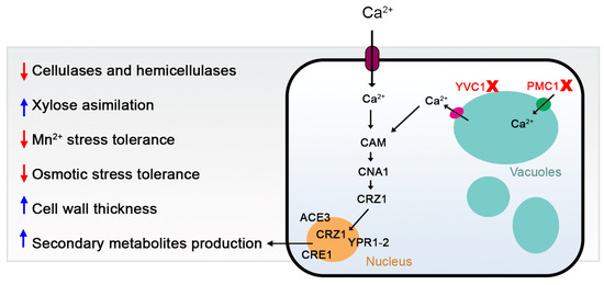 Putative model of the function of the vacuolar calcium transport proteins YVC1 and PMC1 of T. reesei. The deletion of these proteins impairs the dynamics of calcium transport in the vacuoles, therefore, when extracellular calcium enters the cells, the calcium-mediated signaling does not occur properly, as the expression of the transcription factors ACE3, CRZ1, CRE1, YPR1, and YPR2 are increased/decreased, causing a reduction in cellulases/hemicellulases expression, manganese and osmotic stress tolerance and an increase in xylose assimilation and in cell wall thickness. red arrows down—down-regulation effect and blue arrows up—up-regulation effect.