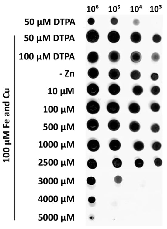 To analyze growth in different concentrations of zinc, the chemically defined MMcM medium [35], pH 6.8, glucose 1%, was used. For this, conidia were counted in Neubauer’s chamber to adjust the density to 108. Then, 106 to 103 conidia were plated on MMcM agar plates containing different concentrations of zinc (ZnSO4): 0, 10, 100, 500, 1000, 2500, 3000, 4000, and 5000 μM. Additionally, growth was tested in 50 μM of the zinc chelating agent DTPA (diethylenetriamine pentaacetic acid, D6518-Sigma Aldrich, Saint Louis, MO, USA) with and without the supplementation of 100 μM of iron ((NH4)2Fe(SO4)2.6H2O) and 100 μM of copper (CuSO4) to check possible unspecific metal chelation by DTPA [36]. Following this test, iron and copper were added to all tested conditions. Plates were incubated at 28 °C, and growth was registered after 7 days.