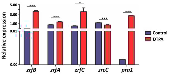 Relative expression of genes involved in zinc homeostasis in F. pedrosoi. Quantitative real-time PCR was carried out with F. pedrosoi transcripts obtained after 3 h of exposure to 100 μM zinc (control) and 100 μM DTPA, in biological duplicates. The relative amount of mRNA was normalized using the constitutive gene encoding β-tubulin as a reference. Data are expressed as the mean ± standard deviation of experimental triplicates. Statistically significant differences were determined by Student’s t-test (* = p < 0.05; *** = p < 0.001).