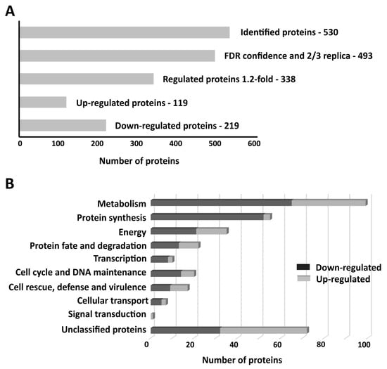 Considering that F. pedrosoi has a homeostatic machinery, represented by membrane transporters, that is activated under zinc-limiting conditions, the adaptive responses to zinc deprivation were investigated by a proteomic approach using nanoUPLC-MSE. The proteomic data acquired in zinc-limiting and control conditions at 48 h resulted in the identification of 530 proteins (Figure 3A). As a proteomic quality filter, a total of 493 proteins presenting the FDR cut-off (4%) and found in at least two replicates were selected for further analysis. Using a 1.2-fold cut-off, 338 proteins were found as regulated by zinc availability. Of those, 119 proteins were upregulated (Table S2), and 219 were downregulated (Table S3). Metabolism and protein synthesis, followed by energy, were the most enriched functional categories among the downregulated proteins. Within the upregulated group, most proteins were related to metabolism and energy (Figure 3B).