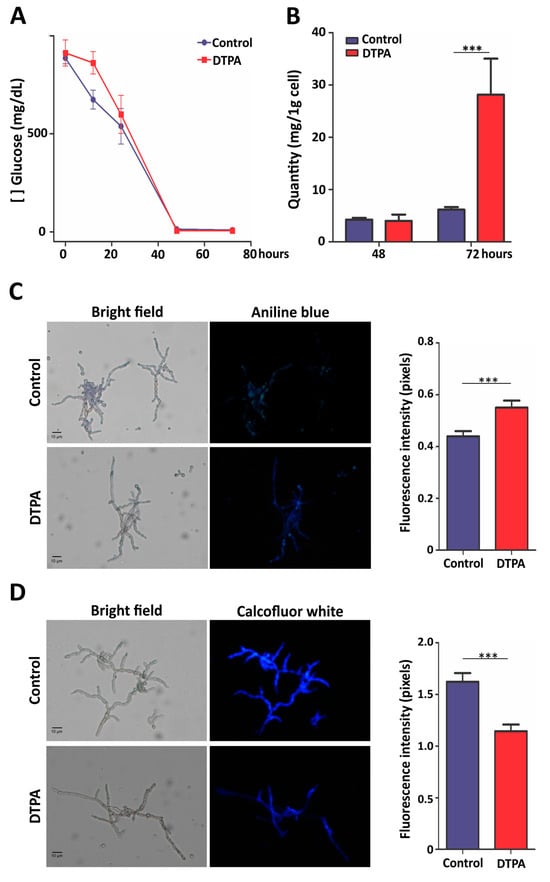 Glucose consumption and carbohydrate evaluation in F. pedrosoi under zinc limitation. (A) Glucose dosage in culture supernatants of cells grown in control and DTPA conditions. (B) Dosage of total carbohydrate in cells after 48 and 72 h of growth in the specified conditions. (C) Evaluation of β-1,3-glucans stained with Aniline Blue and visualized by fluorescence microscopy. (D) Detection of chitin content by Calcofluor White. The fluorescence intensity (in pixels) of the stained cells was quantified. Statistically significant differences were determined by Student’s t-test (*** = p < 0.001). Images were obtained at 400× magnification. Control: 100 μM ZnSO4; DTPA: 100 μM of zinc chelator DTPA.