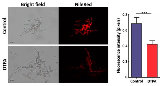 Influence of zinc limitation on lipid droplets. Lipids stained with Nile Red were visualized by fluorescence microscopy. The fluorescence intensity (in pixels) of the stained cells was quantified. Statistically significant differences were determined by Student’s t-test (*** = p < 0.001). Images were obtained at 400× magnification. Control: 100 μM ZnSO4; DTPA: 100 μM of zinc chelator DTPA.