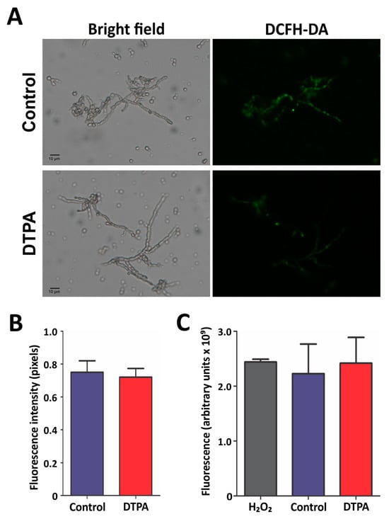 F. pedrosoi response to oxidative stress. (A) Intracellular ROS content was detected by the DCFH-DA probe and evaluated by fluorescence microscopy. (B) The fluorescence intensity (in pixels) of the DCFH-DA stained cells was quantified. Statistically significant differences were determined by Student’s t-test. The images were obtained at 400× magnification. (C) Cell-free ROS labeled with DCFH-DA were detected by spectrofluorometry. As a control, 2% H2O2 was used. Control: 100 μM ZnSO4; DTPA: 100 μM of zinc chelator DTPA.