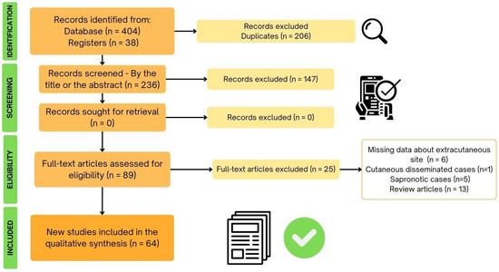 A systematic review was performed, following the PRISMA guidelines [39], using the databases Pubmed, SciELO, Web of Science, and LILACS, which were last consulted in February 2024. Aiming to expand the search, references of the selected articles were reviewed to find additional articles. Descriptors were (extracutaneous and sporotrichosis) OR (epidemiological and Sporothrix and brasiliensis) OR (disseminated and Sporothrix and brasiliensis) OR (pulmonary and Sporothrix and brasiliensis) OR (ocular and Sporothrix and brasiliensis) OR (nasal and Sporothrix and brasiliensis) OR (hypersensitivity and Sporothrix and brasiliensis) OR (osteoarthritis and Sporothrix and brasiliensis) OR (osteomyelitis and Sporothrix and brasiliensis) OR (meningeal and Sporothrix and brasiliensis). No automation tools were used to search articles, and two researchers performed the search independently, reducing the bias.
