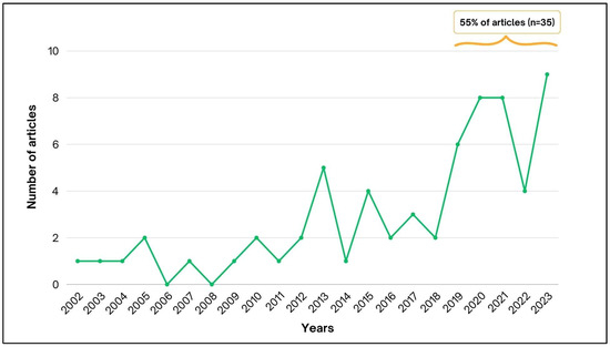 The first case of atypical zoonotic sporotrichosis was published in 2002. Nearly half of the articles (55%; 35/64) were published in the last five years (2019–2023), which correspond to an increase of 700% in comparison with the number of publications from the first 5 years of our review (Figure 2) [13,14,15,17,18,19,20,21,22,24,25,26,27,28,29,31,32,34,35,36,37,41,42,43,44,45,46,47,48,49,50,51,52,53,54,55,56,57,58,59,60,61,62,63,64,65,66,67,68,69,70,71,72,73,74,75,76,77,78,79,80,81,82,83].